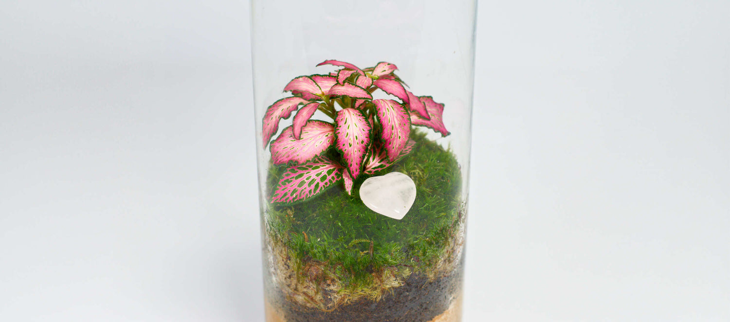 Para celebrar lo mucho que os queremos hemos añadido una versión de todos nuestros terrarios con un corazón de cuarzo rosa incrustado sobre el musgo, una pieza única para esa persona especial
