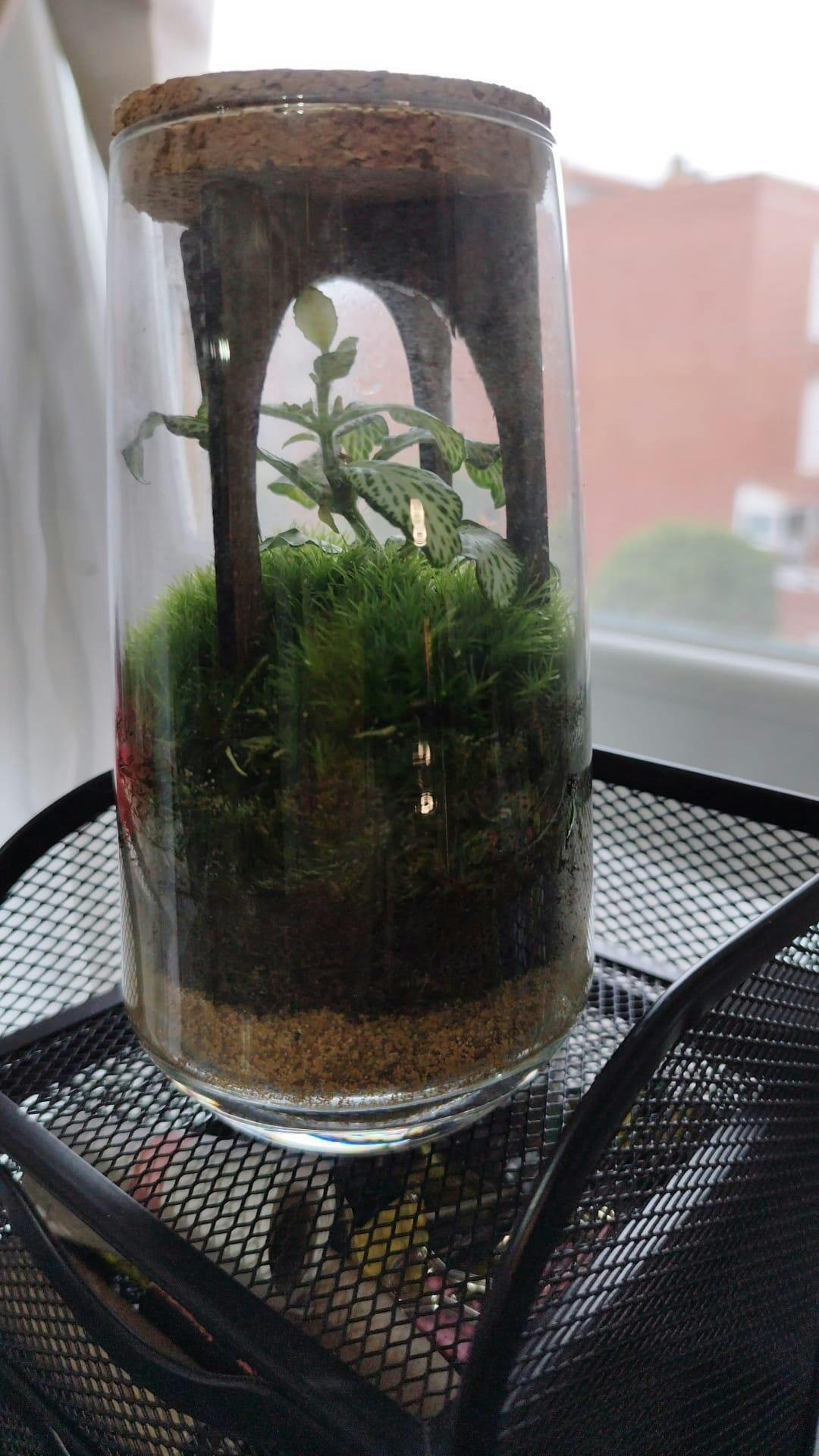 • Materiales: Compuesto por una combinación de arenas naturales, sustrato, musgo bola danés y una fitonia como pieza central